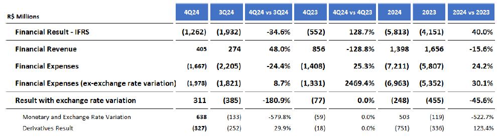 ·In turn, the Financial Result was negative by R$ 1,262 million in 4Q24, which represents a reduction of 34.6% in relation to the previous quarter and reflects the drop in financial expenses due to the positive impact of the exchange rate variation on investments abroad. In the year, the Financial Result was negative by R$ 5,814 million, an increase of 40.1% due to the impact of the increase in interest on financial expenses, as well as the negative effect of the devaluation of Usiminas shares.