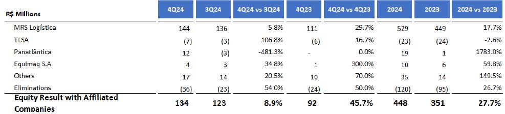 ·The Equity Result recorded another good performance in 4Q24, reaching R$ 134 million, which corresponds to an increase of 8.9% compared to 3Q24, as a result of the high performance that MRS has been able to achieve in recent quarters, in addition to the positive effect that the improved environment in the steel industry has had on Panatlântica's results. In the year, the equity result was positive at R$ 448 million, which corresponds to a growth of 27.7% when compared to 2023.