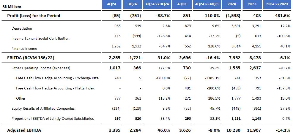 ·In 4Q24, the group of Other Revenues and Operating Expenses recorded a negative balance of R$ 1,016 million, which corresponds to an increase of R$ 650 million over the previous quarter. This impact was driven by the effect of hedge accounting, in line with the schedule of exports designated to offset the exchange rate variation of debts, as well as extraordinary effects, including tax expenses from dividends received abroad and inventory losses. In 2024, the set of Other Revenues and Operating Expenses was negative by R$ 1,565 million, representing a reduction of 40.6% compared to 2023, reflecting the positive balance of hedge operations.