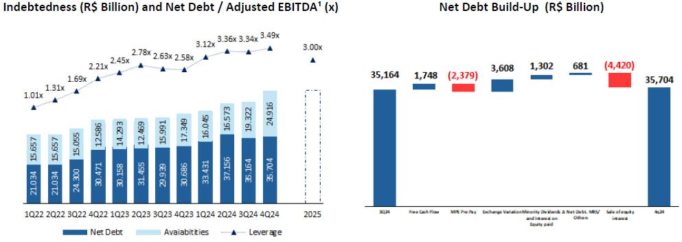 Adjusted Cash Flow in 4Q24 was negative at R$ 1,748.0 million, which represents a 77.3% worsening in relation to the previous quarter, even with the operational improvement seen in the period. This result reflects the impact of financial expenses due to the exchange rate variations and the higher level of investments made, which is typical for this time of the year.