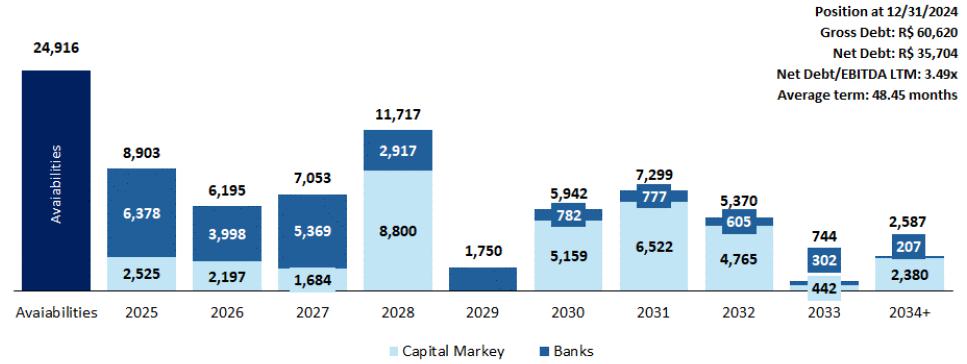 CSN continues to be very active in its goal of extending its amortization period, with a focus on long-term operations. Among the main operations in 4Q24, the company raised funds and refinanced some bilateral contracts with amortization flows between 2027 and 2029.