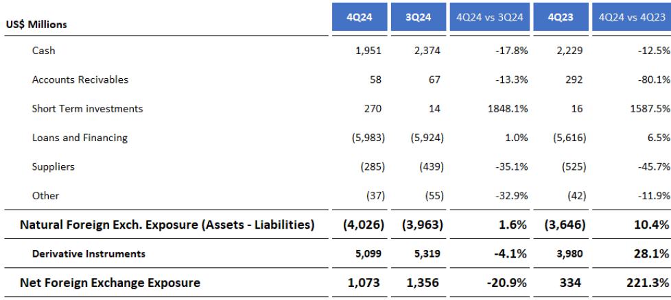 The net foreign exchange exposure accumulated in the 4Q24 consolidated balance sheet was US$ 1,073 million, as shown in the table below, in line with the company's policy of minimizing the impact of exchange rate volatility on results. The Hedge Accounting adopted by CSN correlates the projected flow of exports in dollars with future debt maturities in the same currency. As a result, the exchange rate variation of the dollar debt is temporarily recorded in shareholders' equity and is taken to the income statement when the dollar revenues from these exports occur.