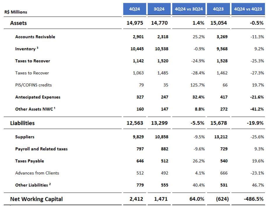 Net Working Capital applied to the business was R$ 2,412 million in 4Q24, further advancing on the solid result recorded in the previous quarter, which reflects the increase in accounts receivable due to the operational improvement and increase in the iron ore price, in addition to the reduction in the supplier line, given the adjustment of the forfaiting lines.