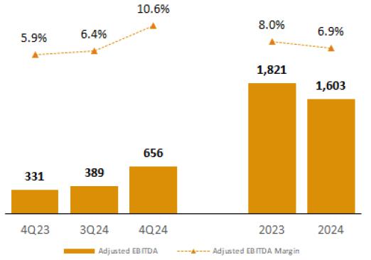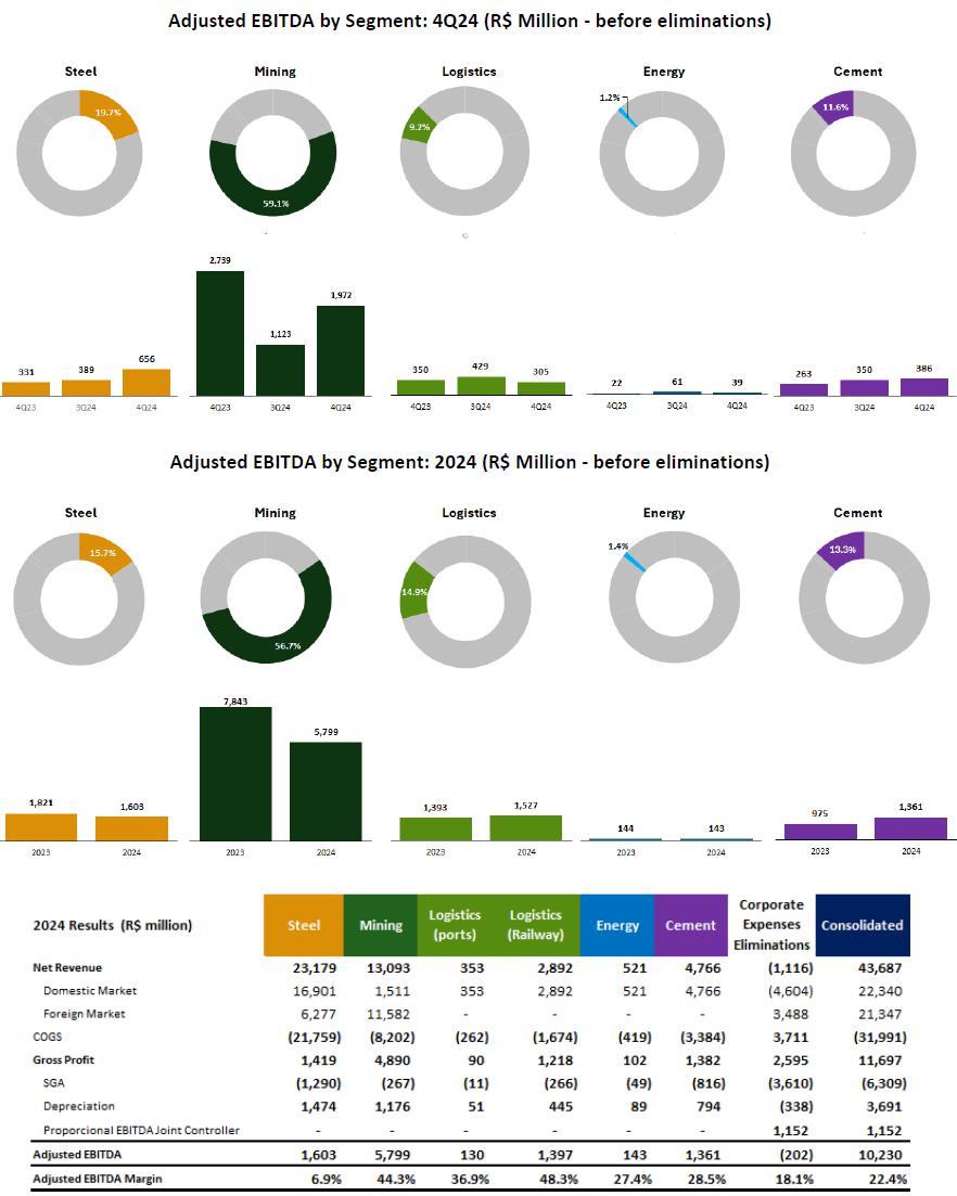 ·In 4Q24, Adjusted EBITDA reached R$ 3,335.0 million, with an Adjusted EBITDA margin of 26.8% or 7.1 p.p. higher than in the previous quarter. This improved performance is the result of a combination of higher realized prices in mining and cement, as well as a substantial improvement in the steel segment. As a result, even in a seasonally weaker quarter and with a higher incidence of rainfall, it was possible to see EBITDA 46.0% higher than in 3Q24, also helping to highlight all the operational excellence that the company has been able to generate in recent quarters. In the year, adjusted EBITDA reached R$ 10.2 billion, with an adjusted EBITDA margin of 22.4% or 2.9 p.p. below the previous year as a consequence of the lower price of iron ore seen throughout the year, in addition to all the pressure that the increase in import penetration brought to the steel segment in 2024.