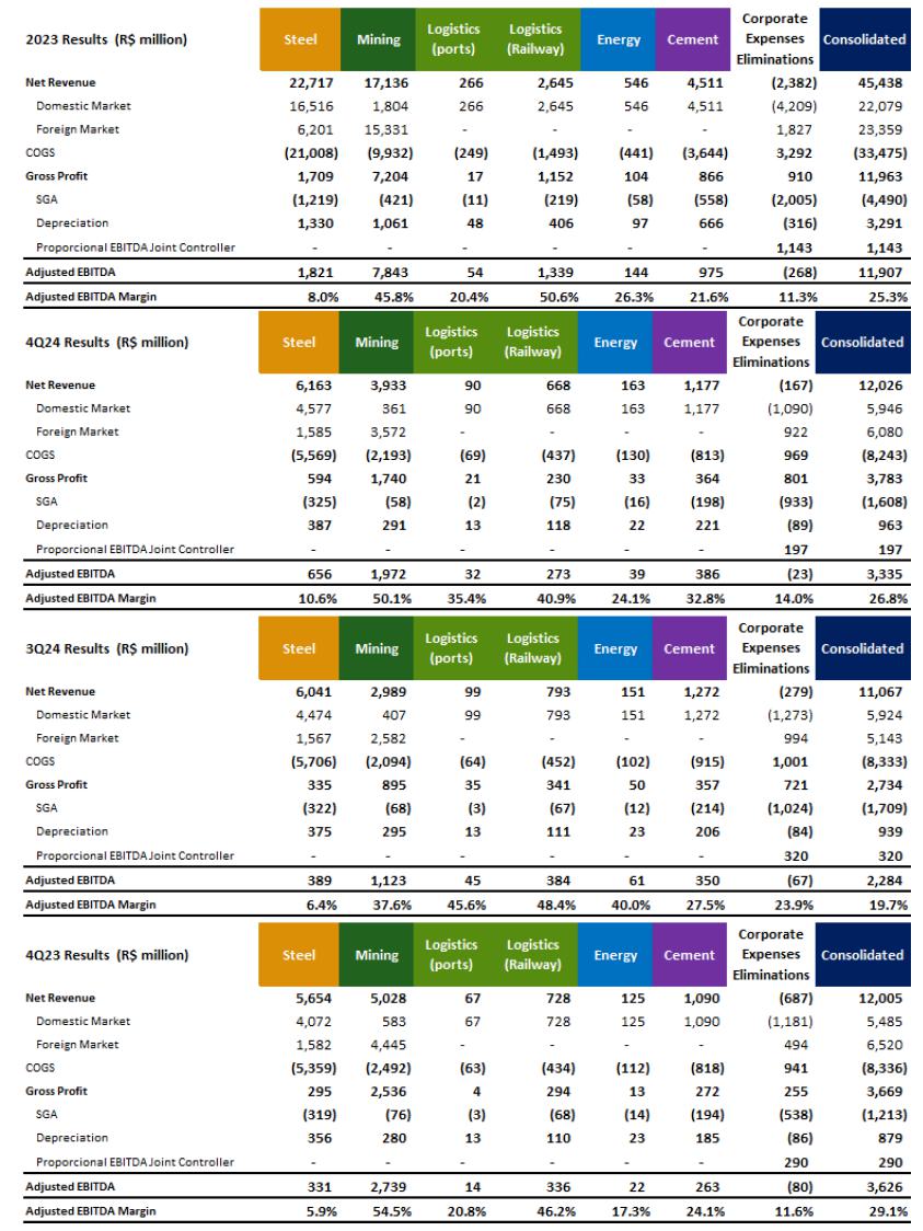 ·Cost of Goods Sold (COGS) totaled R$ 8,243.1 million in 4Q24, down 1.1% on the previous quarter, reflecting cost reductions in the steel and cement segments. In 2024, COGS totaled R$ 31,991 million, which represents a reduction of 4.4% in relation to the previous year and mainly reflects the lower quantity of iron ore purchases from third parties.