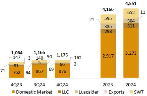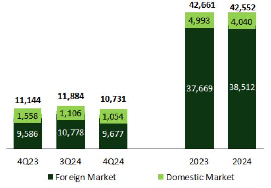 Total sales in 4Q24 amounted to 1,175 thousand tons, a small increase of 0.8% compared to the previous quarter, which demonstrates the strength of the company's commercial activity in overcoming the negative seasonality of the period. When compared to the same period in 2023, sales increased by 10.4%, a performance in line with the strong apparent consumption of the domestic market, which accounted for the sale of 876 thousand tons of steel products, representing a massive annual growth of 15.0%. All this performance reinforces the assertive commercial strategy adopted by CSN, as well as the continued upturn in industrial activity with higher steel consumption. In the foreign market, sales totaled 299 thousand tons in 4Q24, in line with 3Q24 and 1.1% below the same quarter of the previous year, with 2 thousand tons being exported directly and 297 thousand tons sold by subsidiaries abroad, of which 66 thousand tons by LLC, 162 thousand tons by SWT and 69 thousand tons by Lusosider.