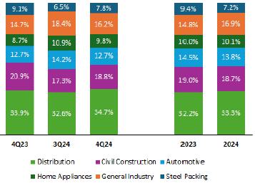 In terms of total sales volume, the main highlight in 4Q24 was the Distribution segment, with a 2.1 p.p. increase compared to the volume sold in the previous quarter, reaching 34.7% of total volume. In turn, the General Industry segment (16.2%) was the segment that lost the most share of sales due to seasonality and greater commercial activity in the other segments. When comparing total sales volume in 4Q24 with 4Q23, the Construction segment fell by 2.3 p.p. to 18.8%, followed by Packaging, which fell by 1.3 p.p. to 7.8%. When comparing 2024 with 2023, there were significant recoveries in General Industry (2.1 p.p.) and Distribution (1.1 p.p.), but falls in the Auto (-0.3 p.p.) and Packaging (-2.3 p.p.) segments.