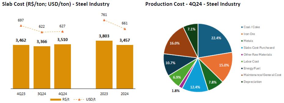 ·In turn, the Slab Cost in 4Q24 reached R$3,510/ton, an increase of 4.3% compared to the previous quarter, reflecting the increase in the cost of imported raw materials due to the strong currency devaluation recorded in the period. In 2024, the Slab Cost reached R$ 3,457/ton, or a reduction of 9.1% compared to the previous year, reflecting a greater dilution of fixed costs and less pressure from raw material prices.
