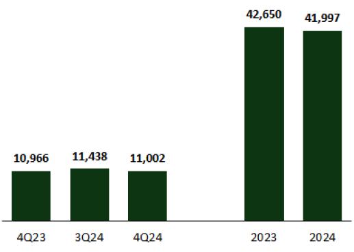 ·Sales volume, in turn, was 10,731 thousand tons in 4Q24, 9.7% below the volume recorded in the third quarter of 2024, which is in line with the impact of the rains on the pace of production. Compared to 4Q23, there was also a 3.7% drop in the pace of sales, despite the increase in shipments during the period, reflecting the lower volume recorded on the domestic market. In 2024, the sales volume was 42,552 thousand tons, in line with 2023. Another important highlight in 2024 was the record number of tons shipped at TECAR terminal, which allowed the company not to depend on third-party ports, helping to reduce logistics costs and maximize results.