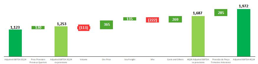 ·Adjusted EBITDA reached R$ 1,972 million in 4Q24, with a quarterly Adjusted EBITDA margin of 50.1%, representing strong growth of 12.6 p.p. over the previous quarter. This greater profitability is the exclusive consequence of the recovery in prices, coupled with the solid operating results achieved in the period. In 2024, adjusted EBITDA from mining was R$ 5.8 billion, with an adjusted EBITDA margin of 44.3%, which represents a drop of 1.5 p.p. compared to the previous year even with a 9.3% drop in the iron ore average price, which demonstrates all the operational excellence recorded in the period.