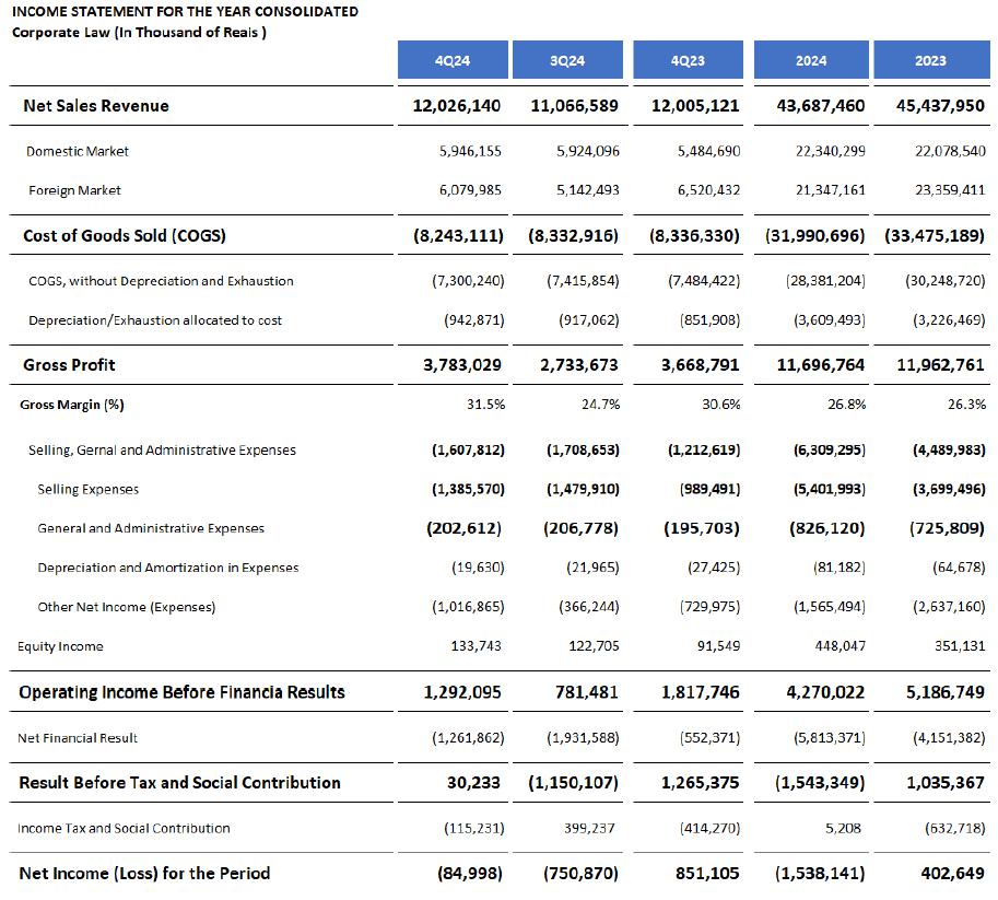 ·In the fourth quarter of 2024, CSN recorded a net loss of R$ 85 million, an improvement of 88.7% on the previous quarter, reflecting the strong operating result recorded in the period. This performance was offset by the still high volume of financial expenses and the higher incidence of taxes. In 2024, the company recorded a net loss of R$ 1.5 billion, which contrasts with the net profit of R$ 402.6 million recorded in the previous year and reflects the worsening commodity prices seen throughout 2024, as well as the increase in financial expenses.