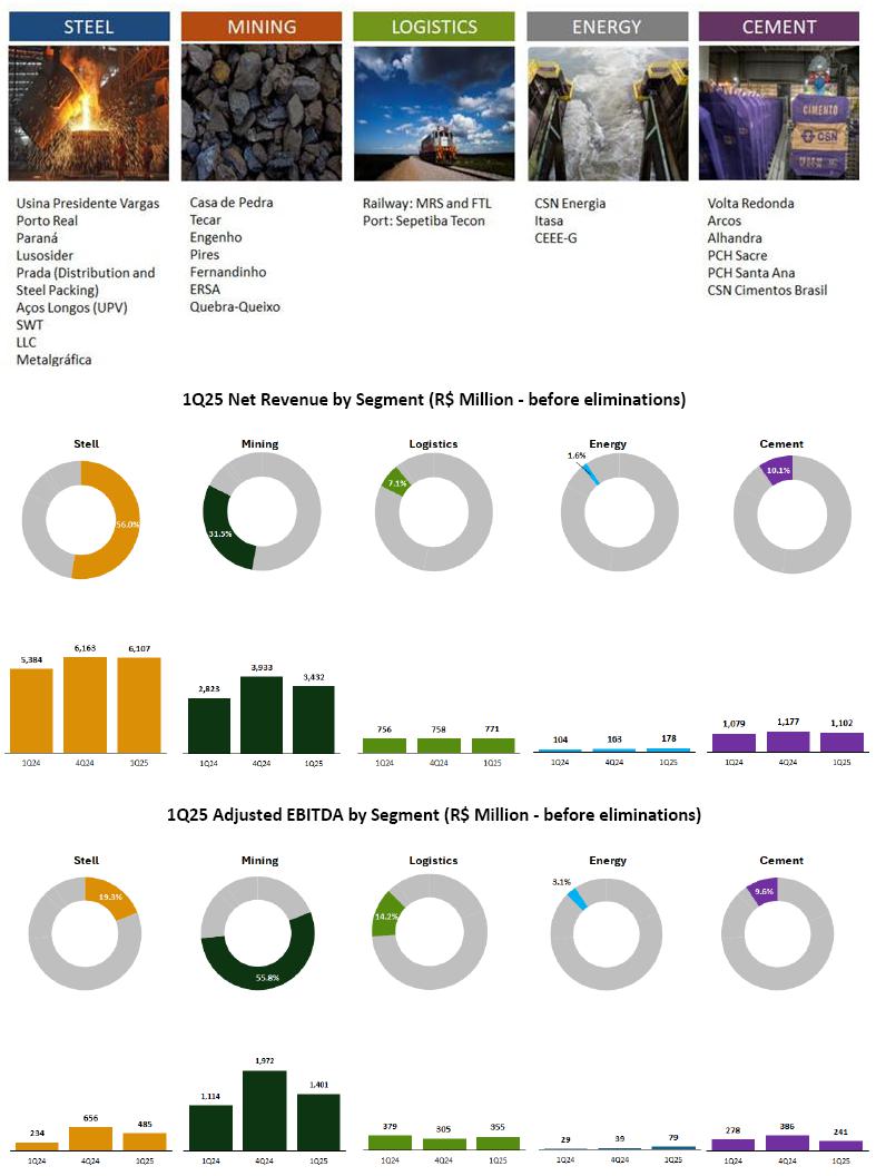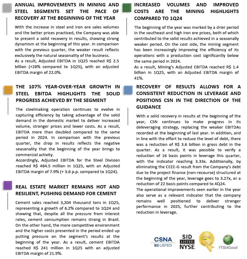 São Paulo, May 8, 2025 - Companhia Siderúrgica Nacional ("CSN") (B3: CSNA3) (NYSE: SID) announces its results for the first quarter of 2025 (1Q25) in Brazilian Reais, with its financial statements being consolidated in accordance with the accounting practices adopted in Brazil issued by the Brazilian Accounting Pronouncements Committee ("CPC"), approved by the Brazilian Securities and Exchange Commission ("CVM") and the Federal Accounting Council ("CFC") and in accordance with the International Financial Reporting Standards ("IFRS"), issued by the International Accounting Standards Board ("IASB").