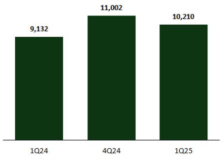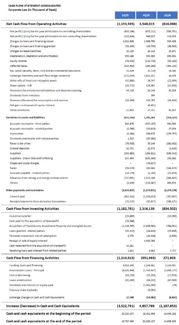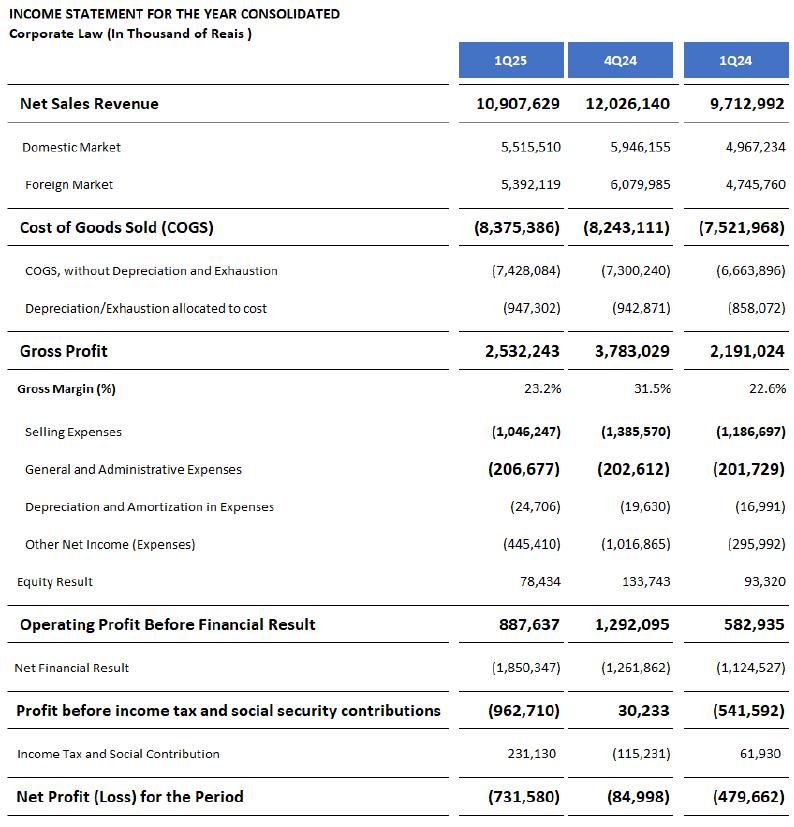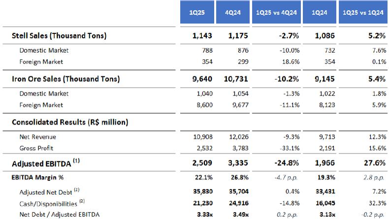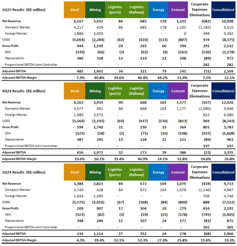 ·In 1Q25, Net Revenue totaled R$ 10,908 million, representing a decrease of 9.3% compared to the previous quarter, basically reflecting seasonality with the lower commercial activity characteristic of the period, in addition to the higher incidence of rain in mining. However, when compared to the same period in 2024, net revenue was 12.3% higher, highlighting the increase in volumes and prices in the main operating segments.