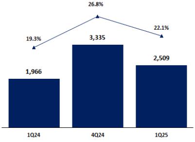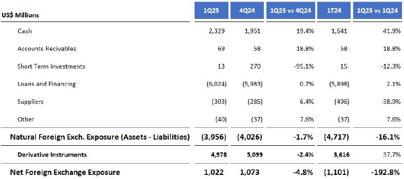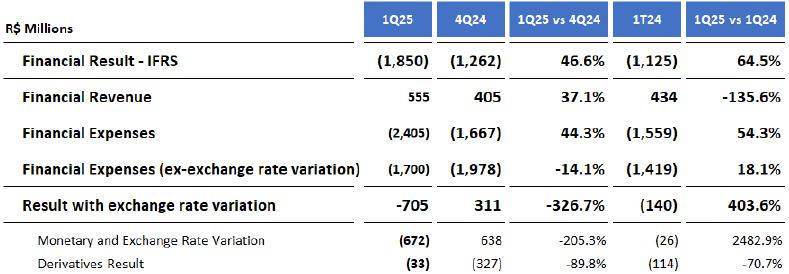 ·In turn, the Financial Result was negative at R$ 1,850 million in 1Q25, which represents an increase of 46.6% in relation to the previous quarter and reflects the increase in financial expenses due to the negative impact of exchange rate variation on investments abroad.