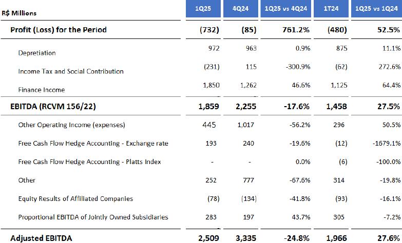 ·Adjusted EBITDA amounted to R$ 2,509 million in the first quarter of 2025, with an adjusted EBITDA margin of 22.1%, down 4.7 p.p. from the previous quarter. This lower profitability reflects the seasonality of the business, due to weaker commercial activity and higher rainfall during the period. Nevertheless, compared to 1Q24, adjusted EBITDA increased by 27.6%, highlighting not only the consistent operational improvement with volume growth across all segments, but also the benefit of higher prices and enhanced cost control. In this sense, it is important to note that this improvement trend has been continuously observed in recent quarters, paving the way for the delivery of a stronger result throughout this year.