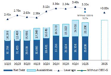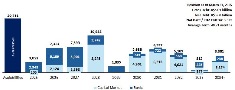 CSN continues to be very active in pursuing its strategy of extending debt maturities, with a clear focus on long-term financing. Among the main movements in 1Q25 are the 3rd issuance of debentures by CEEE-G, a subsidiary of the Company, in the amount of R$ 1.2 billion and a total term of 17 years, in addition to the raising of funds and refinancing of some bilateral contracts with amortization flows of up to 3 years. These initiatives contributed to a 66% reduction in the 2025 debt tower.