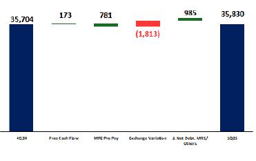 In 1Q25, Adjusted Cash Flow was negative at R$ 173 million, a significant improvement compared to the negative R$ 1.7 billion recorded in the previous quarter, despite the lower EBITDA in the period. This result reflects a solid operating performance, supported by lower capital expenditures and a recovery in working capital. Despite this, adjusted cash flow remains under pressure from high financial expenses, which temporarily inhibit positive cash generation.