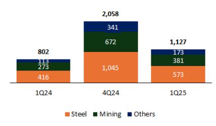 ·In 1Q25, Adjusted EBITDA in the Steel Segment reached R$ 485 million, a decrease of 26.1% compared to the previous quarter due to the seasonality of the period. However, EBITDA was 107.2% higher than in 1Q24. The Adjusted EBITDA margin was 7.9%, up 3.6 percentage points year-on-year. This significant improvement in profitability - EBITDA more than doubled year-on-year - reflects the more favorable dynamics observed in the Steel segment since the second half of 2024, driven by a recovery in both volumes and prices. Despite prevailing uncertainties, including increased penetration of imported products and concerns about the sustainability of demand, the segment has delivered solid results so far with positive signs for steel consumption.
