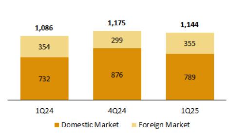 Total steel sales in 1Q25 amounted to 1,144 thousand tons, a slight reduction of 2.6% compared to the previous quarter, despite the typically lower commercial activity at the beginning of the year. This result underscores the effectiveness of CSN's commercial strategy to take advantage of favorable market conditions. Year-on-year, total sales increased by 5.3%, reflecting robust apparent consumption in the domestic market. Domestic sales amounted to 789 thousand tons, a strong increase of 7.8% compared to 1Q24. This solid performance highlights the resilience of the Brazilian market, which was able to absorb a higher volume of steel even under pressure from imported materials.