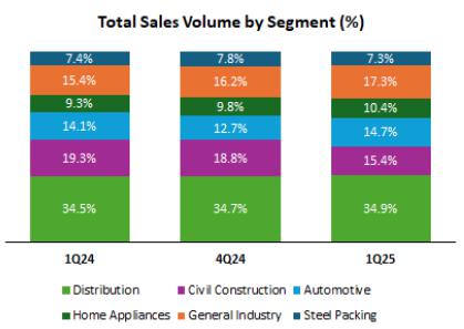 In terms of sales mix, the Automotive segment was the highlight of 1Q25, gaining 2.0 p.p. from the previous quarter and accounting for 14.7% of total sales. This was followed by General Industry and Home Appliances, which grew by 1.2 p.p. and 0.6 p.p., respectively, to reach 17.3% and 10.4% of total volume. In turn, the Civil Construction segment (15.4%) was the segment that lost the most share in sales due to seasonality and greater commercial activity in the other segments. When we compare the total sales volume of 1Q25 with 1Q24, the biggest difference came in the Civil Construction segment, which suffered a 4.0 p.p. reduction in share, while General Industry captured part of this gain.