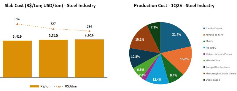 ·In turn, the Slab Cost in 1Q25 reached R$ 3,515/ton, stable in relation to the previous quarter, with the lower dilution of fixed costs being offset by the drop in the prices of imported raw materials.