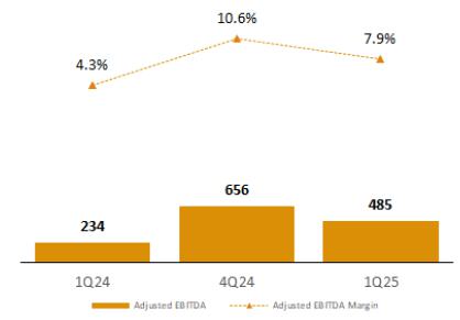·As a result, Adjusted EBITDA reached R$ 241 million in 1Q25, a decrease of 37.6% compared to the previous quarter and 13.3% compared to 1Q24. Despite a solid operating result for the period, the lower EBITDA recorded in the quarter was due to a more challenging competitive environment, particularly in terms of pricing, as well as higher raw material costs and lower fixed cost dilution, which limited performance improvement.