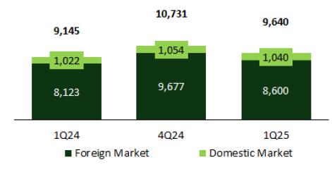 Sales to the foreign market, in turn, had an even stronger performance in 1Q25, with sales accounting for 355 thousand tons, in line with 1Q24, but an increase of 18.7% when compared to the previous quarter, with 2 thousand tons being exported directly and 353 thousand tons sold by subsidiaries abroad, being 68 thousand tons by LLC, 195 thousand tons by SWT and 90 thousand tons by Lusosider.