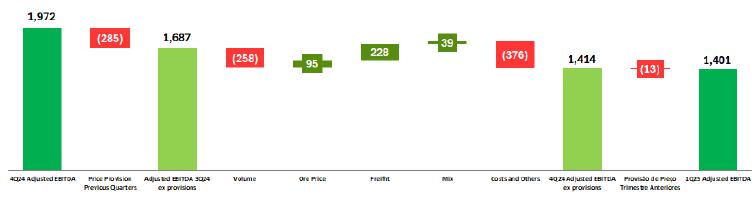 ·In 1Q25, Adjusted EBITDA reached R$ 1,401 million in 1Q25, with a margin of 40.8%. The lower margin compared to 4Q24 - down 9.3 p.p.- was mainly due to seasonal effects, including lower shipment volumes and lower fixed cost dilution. On the other hand, Adjusted EBITDA increased 25.7% compared to 1Q24, driven by higher volumes, lower C1 costs, reduced quality discounts and lower sea freight rates.