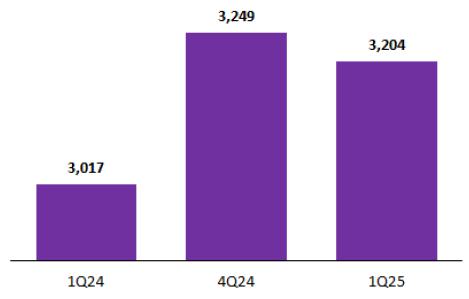Net working capital applied to the business was R$ 2,286 million in 1Q25, representing a reduction of 5.2% compared to the previous quarter, reflecting the decrease in accounts receivable due to seasonality, as well as the lower volume of inventories and supplier line.