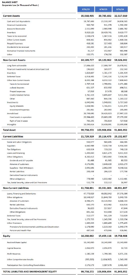 At March 31, 2025, consolidated net debt amounted to R$ 35,830 million, with a net debt/EBITDA (LTM) leverage ratio of 3.33x, a reduction of 16 basis points compared to the previous quarter. This reduction reflects the operational progress the company has made in recent quarters, successfully replacing weaker Adjusted EBITDA, such as those at the beginning of 2024 by combining higher volumes, rigorous cost control and greater efficiency. In addition, significant efforts were made to reduce Gross Debt by R$ 3.6 billion during the period. These ongoing efforts are essential to achieving the Company's year-end leverage guidance and reinforce CSN's commitment to deleveraging, even in times of heightened uncertainty and low predictability.