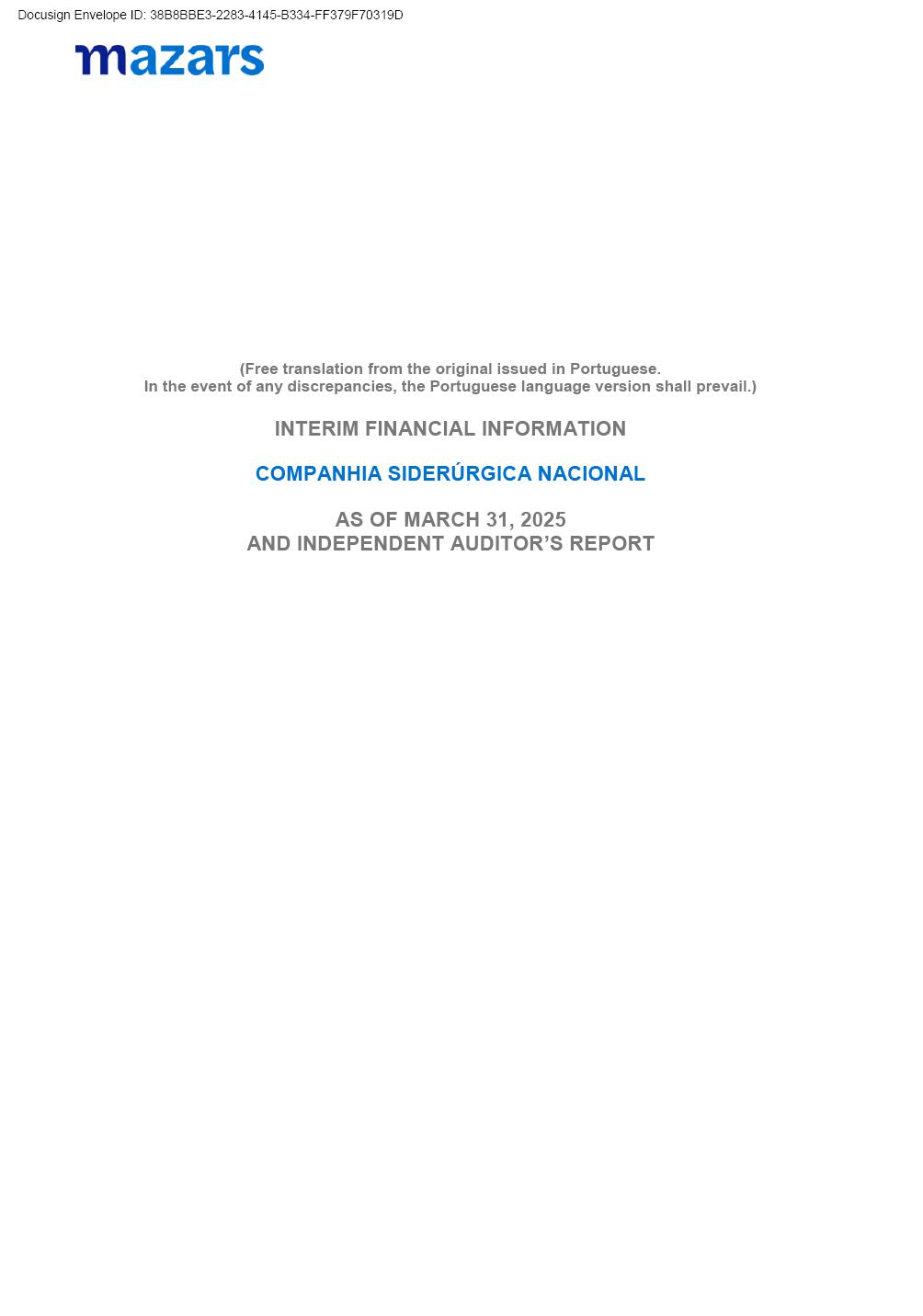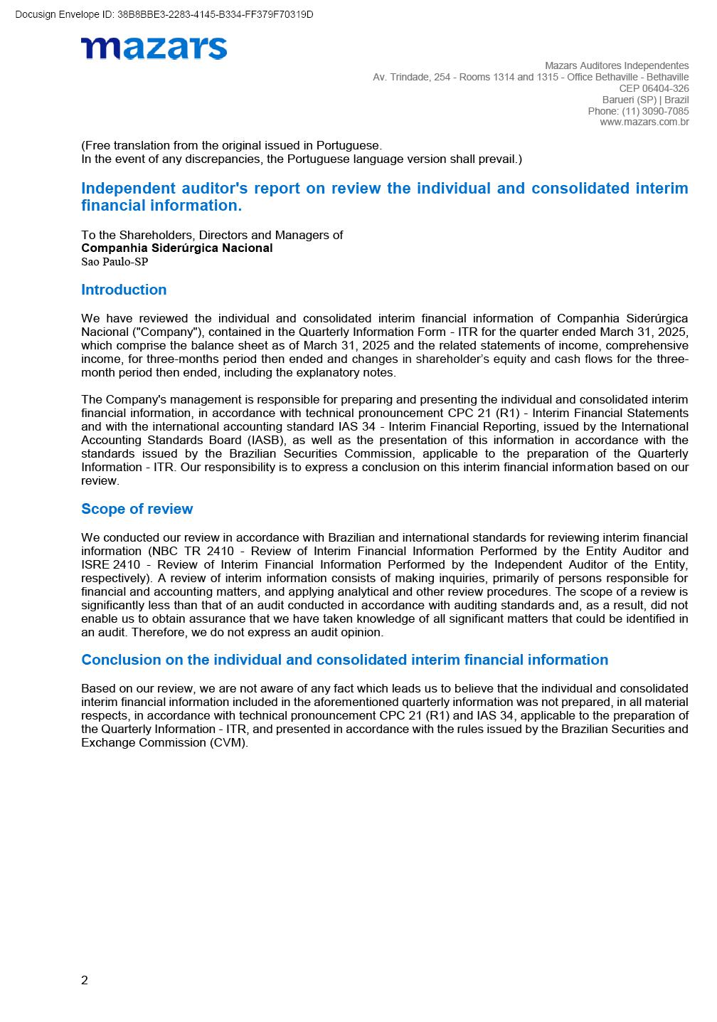 Docusign Envelope ID: 38B8BBE3-2283-4145-B334-FF379F70319D Mazars Auditores Independentes Av. Trindade, 254 - Rooms 1314 and 1315 - Office Bethaville - Bethaville CEP 06404-326 Barueri (SP) | Brazil Phone: (11) 3090-7085 www.mazars.com.br (Free translation from the original issued in Portuguese. In the event of any discrepancies, the Portuguese language version shall prevail.) 2 Independent auditor’s report on review the individual and consolidated interim financial information. To the Shareholders, Directors and Managers of Companhia Siderúrgica Nacional Sao Paulo-SP Introduction We have reviewed the individual and consolidated interim financial information of Companhia Siderúrgica Nacional ("Company"), contained in the Quarterly Information Form - ITR for the quarter ended March 31, 2025, which comprise the balance sheet as of March 31, 2025 and the related statements of income, comprehensive income, for three-months period then ended and changes in shareholder’s equity and cash flows for the threemonth period then ended, including the explanatory notes. The Company’s management is responsible for preparing and presenting the individual and consolidated interim financial information, in accordance with technical pronouncement CPC 21 (R1) - Interim Financial Statements and with the international accounting standard IAS 34 - Interim Financial Reporting, issued by the International Accounting Standards Board (IASB), as well as the presentation of this information in accordance with the standards issued by the Brazilian Securities Commission, applicable to the preparation of the Quarterly Information - ITR. Our responsibility is to express a conclusion on this interim financial information based on our review. Scope of review We conducted our review in accordance with Brazilian and international standards for reviewing interim financial information (NBC TR 2410 - Review of Interim Financial Information Performed by the Entity Auditor and ISRE 2410 - Review of Interim Financial Information Performed by the Independent Auditor of the Entity, respectively). A review of interim information consists of making inquiries, primarily of persons responsible for financial and accounting matters, and applying analytical and other review procedures. The scope of a review is significantly less than that of an audit conducted in accordance with auditing standards and, as a result, did not enable us to obtain assurance that we have taken knowledge of all significant matters that could be identified in an audit. Therefore, we do not express an audit opinion. Conclusion on the individual and consolidated interim financial information Based on our review, we are not aware of any fact which leads us to believe that the individual and consolidated interim financial information included in the aforementioned quarterly information was not prepared, in all material respects, in accordance with technical pronouncement CPC 21 (R1) and IAS 34, applicable to the preparation of the Quarterly Information - ITR, and presented in accordance with the rules issued by the Brazilian Securities and Exchange Commission (CVM).