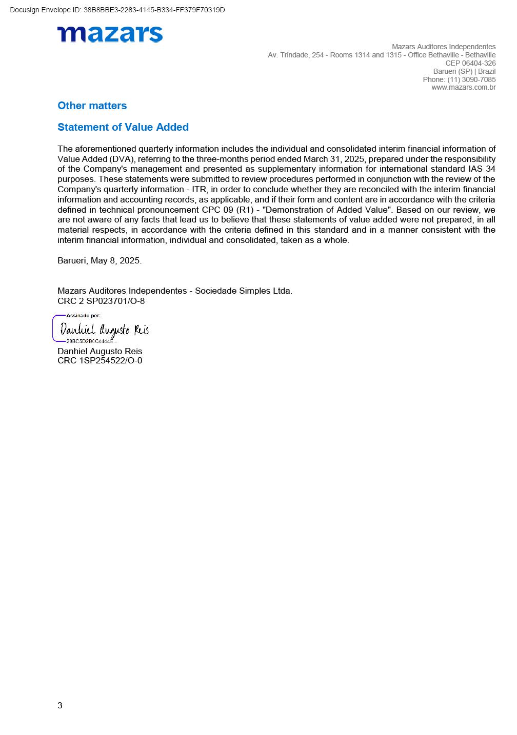 Docusign Envelope ID: 38B8BBE3-2283-4145-B334-FF379F70319D Mazars Auditores Independentes Av. Trindade, 254 - Rooms 1314 and 1315 - Office Bethaville - Bethaville CEP 06404-326 Barueri (SP) | Brazil Phone: (11) 3090-7085 www.mazars.com.br Other matters Statement of Value Added The aforementioned quarterly information includes the individual and consolidated interim financial information of Value Added (DVA), referring to the three-months period ended March 31, 2025, prepared under the responsibility of the Company’s management and presented as supplementary information for international standard IAS 34 purposes. These statements were submitted to review procedures performed in conjunction with the review of the Company’s quarterly information - ITR, in order to conclude whether they are reconciled with the interim financial information and accounting records, as applicable, and if their form and content are in accordance with the criteria defined in technical pronouncement CPC 09 (R1) - "Demonstration of Added Value". Based on our review, we are not aware of any facts that lead us to believe that these statements of value added were not prepared, in all material respects, in accordance with the criteria defined in this standard and in a manner consistent with the interim financial information, individual and consolidated, taken as a whole. Barueri, May 8, 2025. Mazars Auditores Independentes - Sociedade Simples Ltda. CRC 2 SP023701/O-8 Danhiel Augusto Reis CRC 1SP254522/O-0