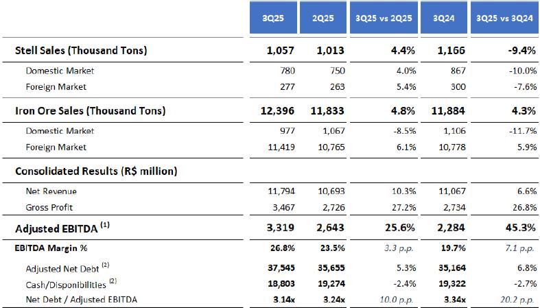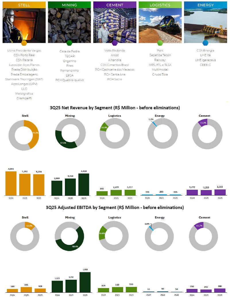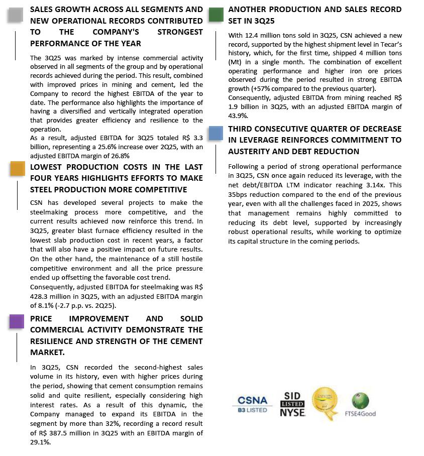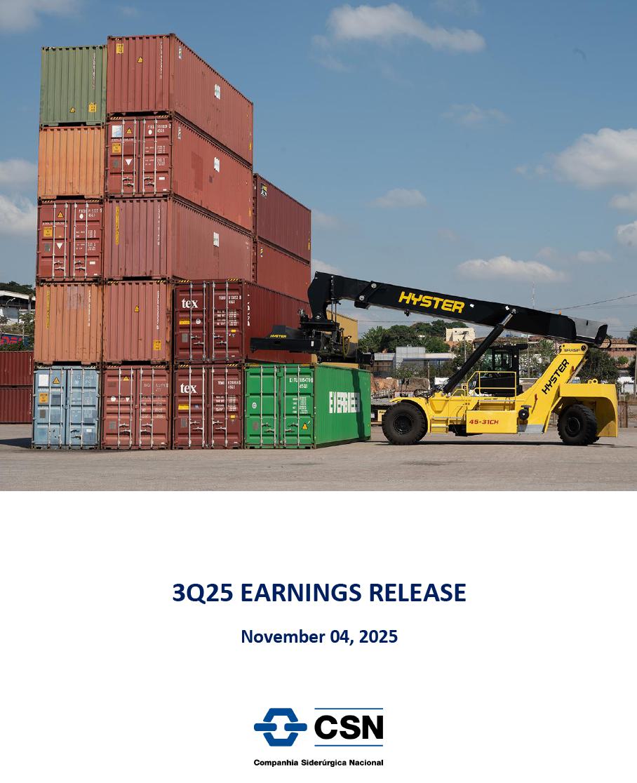 São Paulo, November 4, 2025 - Companhia Siderúrgica Nacional ("CSN") (B3: CSNA3) (NYSE: SID) announces its results for the third quarter of 2025 (3Q25) in Brazilian Reais, with its financial statements being consolidated in accordance with the accounting practices adopted in Brazil issued by the Brazilian Accounting Pronouncements Committee ("CPC"), approved by the Brazilian Securities and Exchange Commission ("CVM") and the Federal Accounting Council ("CFC") and in accordance with the International Financial Reporting Standards ("IFRS"), issued by the International Accounting Standards Board ("IASB").