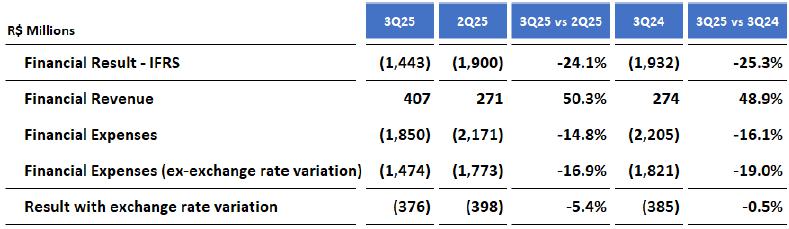 ·In turn, the Financial Result was negative at R$ 1,443 million in 3Q25, representing a 24.1% reduction compared to the previous quarter, as a consequence of better returns on financial investments, in addition to lower interest rates on foreign currency borrowings and a smaller impact from the reduction in participation in Usiminas shares.
