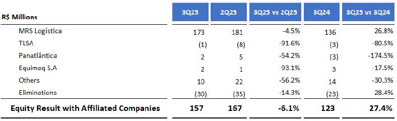 ·Equity Result decreased by 6.1% in 3Q25, reaching R$ 157 million, due to MRS's lower contribution during this period. However, compared to the same period last year, there was a 27.4% increase in equity result due to MRS's high level of efficiency throughout this year.