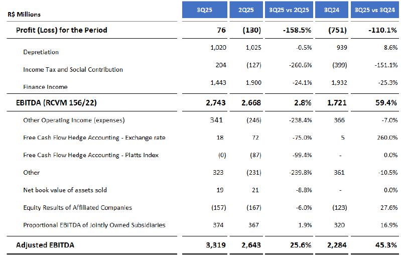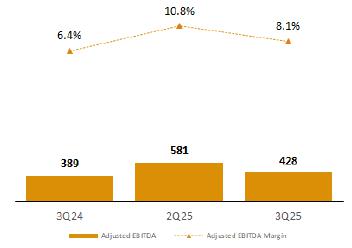 ·As a result, Adjusted EBITDA reached R$ 388 million in 3Q25, representing a 32.1% increase compared to the previous quarter and a 4.9 percentage point expansion in the adjusted EBITDA margin, which reached 29.1% in the period. This result represents the highest EBITDA in the Company's history for the segment and reflects not only the competitive advantages of the operation by having newer plants and a fully vertically integrated operation, but also the assertiveness of the commercial strategy of diversifying customers, combined with a favorable macroeconomic scenario with a positive effect on cement consumption and sales volume.