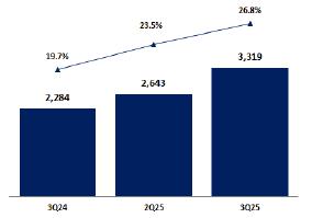 ·In turn, Gross Profit reached R$ 3,467 million in 3Q25, representing an increase of 27.2% and 26.8% compared to the previous quarter and the same period in 2024, respectively. The excellent performance of the mining, cement, and logistics segments was key to the profitability gain observed in the period, resulting in a Gross Margin of 29.4%, which represents an expansion of 3.9 percentage points compared to the previous quarter and 4.7 percentage points in the annual comparison.