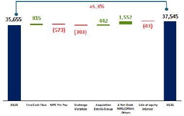 In 3Q25, Adjusted Cash Flow was negative at R$ 815 million. This represents an improvement of 44.7% compared to the previous quarter, but it is still a negative result due to the impact of financial expenses, increased investment activities and working capital consumption.