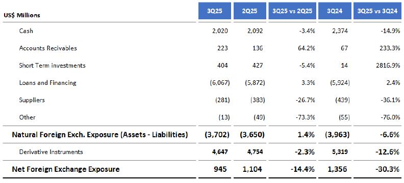The accumulated net foreign exchange exposure in the consolidated balance sheet for 3Q25 was US$ 945 million, as shown in the table below, in line with the company's policy of minimizing the impacts of exchange rate volatility on the result. The hedge accounting adopted by CSN correlates the projected flow of exports in dollars with future debt maturities in the same currency. Consequently, the exchange rate fluctuations of the dollar-denominated debt are temporarily recorded in shareholders' equity and recognized in the results when revenues from these exports occur.