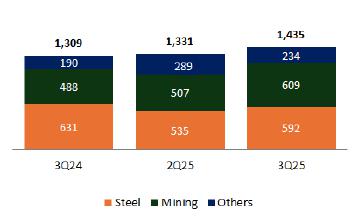 ·Net revenue in the steel industry reached R$ 5,294 million in 3Q25, a performance 1.8% lower than that recorded in the previous quarter, reflecting price pressure stemming from increased penetration of imported material in the Brazilian market, in addition to lower export results. This combination more than offset the higher commercial activity recorded during the period. When compared to 3Q24, net revenue was 12.4% lower, with the external market showing even weaker dynamics.