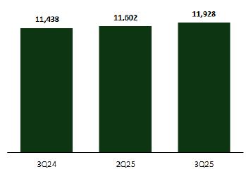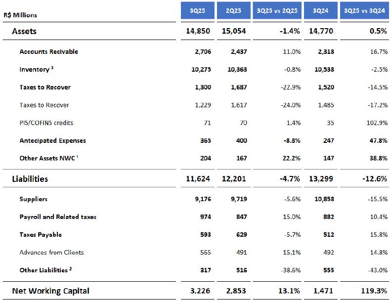 Net Working Capital applied to the business totaled R$ 3,226 million in 3Q25, an increase of 13.1% compared to the previous quarter as a consequence of increased commercial activity impacting accounts receivable, in addition to a reduction in the supplier line due to the settlement of drawn risk operations. Compared to the same period in 2024, net working capital increased by 119.3%, a trend already observed in the previous quarter and which demonstrates the solid financial management, placing the Company in a comfortable position to honor its short-term commitments.