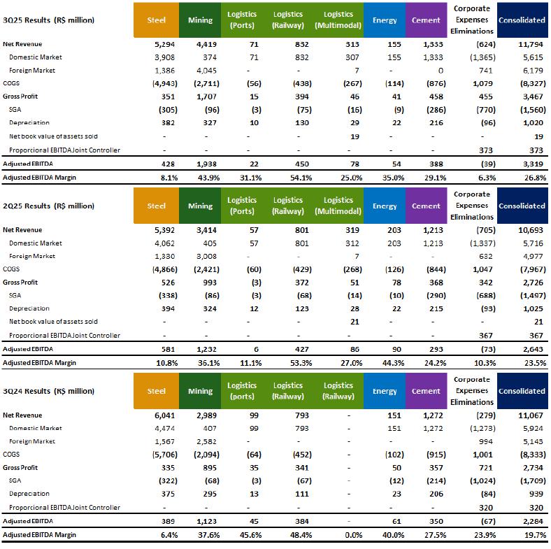 ·Net revenue totaled R$ 11,794 million in 3Q25, representing a significant growth of 10.3% when compared to the previous quarter and 6.6% compared to the same period in 2024. This was primarily driven by the mining segment, which benefited from increased iron ore prices and ongoing operational improvements. Other factors contributing to this performance were the favorable dynamics of the cement segment, which recorded its best quarter of the year through higher volumes and price adjustments, and the increased cargo movement in the logistics segment, which was also impacted by the positive seasonality of the period.