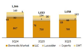 Total sales in 3Q25 reached 1,058 thousand tons, representing a 4.4% increase compared to the previous quarter. This increase reflects the change in commercial strategy adopted throughout the quarter, with the company taking a more aggressive pricing stance to regain competitiveness. The previous strategy of prioritizing value over volume yielded the expected outcome, but it is temporary and it was beneficial to see the recovery in volume when the strategy was reversed. In this context, sales of steel products in the domestic market accounted for 780 thousand tons in 3Q25, representing a 4.0% increase compared to the previous quarter but a 9.9% decrease compared to last year, emphasizing that the market remains heavily impacted by imported materials. Meanwhile, the foreign market continues to face difficulties in exporting amidst tariff disputes and the application of anti-dumping measures around the world. In this scenario, 277 thousand tons were sold in 3Q25, corresponding to a 4.0% increase from the previous quarter but a 7.6% decrease from the same period in 2024. Of this total, 2 thousand tons were exported directly, and subsidiaries abroad sold 275 thousand tons. LLC sold 44 thousand tons, SWT sold 163 thousand tons, and Lusosider sold 69 thousand tons.