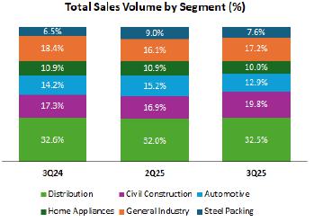 The main highlight regarding total sales volume in 3Q25 was the civil construction segment, which increased its share by 2.9 percentage points compared to last quarter's sales volume, reaching 19.8% of total sales. Following that, we had the General Industry and Distribution segments, which grew by 1.0 and 0.5 percentage points, representing 17.2% and 32.2% of the total volume, respectively. The Automotive segment (12.9%) lost the most sales share due to competition with imported materials. Comparing the total sales volume of 3Q25 with that of 3Q24, the largest differences were seen in the General Industry, Automotive, and Home Appliances segments, which experienced decreases of 1.3, 1.3, and 0.8 percentage points, respectively. Meanwhile, Steel Packing and Civil Construction captured part of this loss, with increases of 1.1 and 2.5 percentage points, respectively.
