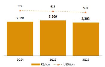 ·In turn, the Slab Cost came to R$ 3,303/ton in 3Q25, marking a 5.9% decrease compared to the previous quarter and a 1.9% reduction from the same period in 2024. This was the lowest production cost recorded in the last 4 years and reflects increased efficiency in the production process, with greater optimization of raw materials and improvements in the combustion process.