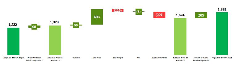 ·Adjusted EBITDA in 3Q25 reached R$ 1,939 million, with a quarterly Adjusted EBITDA margin of 43.9%, representing an increase of 7.8 p.p. and 6.3 p.p. when compared to 2Q25 and 3Q24, respectively. This increase in profitability reflects the recovery in iron ore prices to levels above US$ 100/t, accompanied by the best operational performance ever recorded in the Company's history and efficient cost management.