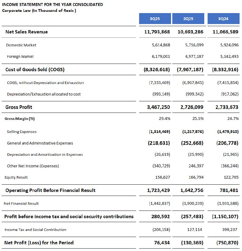 ·In 3Q25, CSN recorded a Net Income of R$ 76 million, representing a significant improvement on the R$ 130 million net loss recorded in the previous quarter. This marked the first profitable quarter of the year for the company, reflecting the operational improvements observed during this period, as well as the positive impact of exchange rate fluctuations on financial expenses and the reversal of taxes recorded during the quarter.