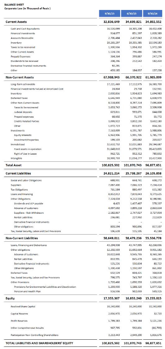 ·In 3Q25, Selling General and Administrative Expenses totaled R$ 1,560 million, which was 4.2% higher than the previous quarter and in line with seasonal trends. Compared to 3Q24, there was an 8.7% decrease due to a lower commercial activity in the steel segment and greater expense control.