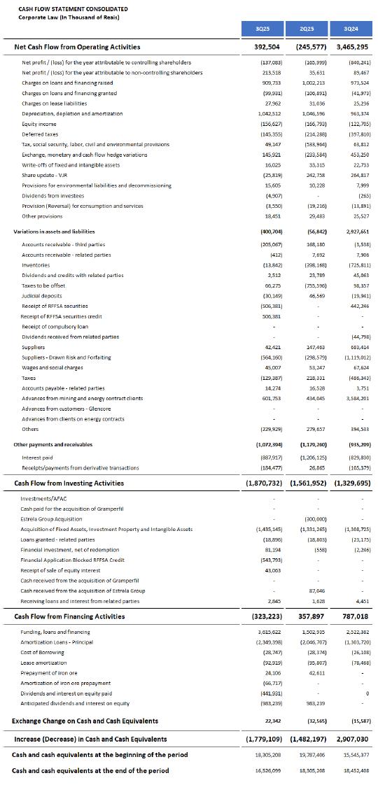 ·Iron Ore Production (including purchases from third parties) reached a new record high of 11,928 thousand tons in the third quarter of 2025. This represents growth of 2.8% compared to the previous quarter and 4.3% compared to last year. This performance reinforces the company's excellent operational momentum, with increasingly efficient management in mine and logistics, as well as growing results in cargo handling. Based on this performance, the company is confident it will meet its annual production and purchasing guidance and expects to reach the upper end of its projected estimate of 42 to 43.5 million tons.