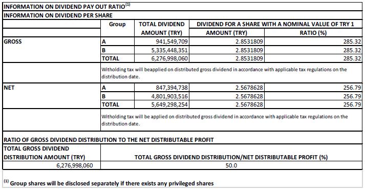 The Board of Directors of the Company decided to distribute gross dividend amount of TRY 6,276,998,060- to be paid in cash to our shareholders within the below conditions explained hereunder as part of the resolution: